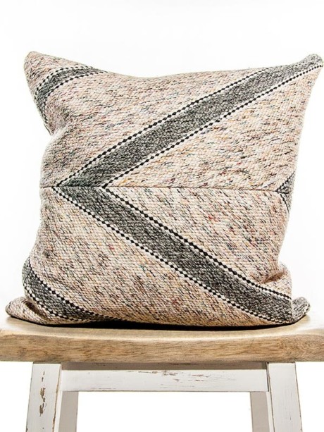 This custom square pillow is made from multiple horizontal & vertical strips of cotton woven together basket style. The weave has been applied in a chevron pattern & has been stabilized to ensure its integrity and stability.