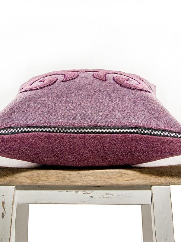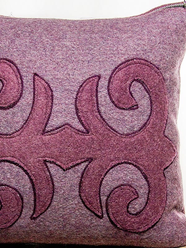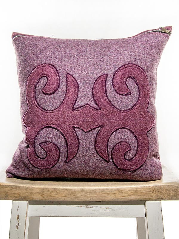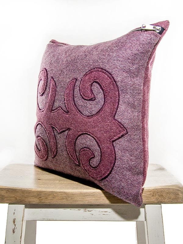 This custom designer throw pillow is made from a “new luxury textile”, it is a second generation design. Color way is Burgundy and Mauve with a slight silver fleck. This is a Moroccan inspired handmade designer throw pillow, an intricate design, based on color blocking. The two different patterns are hand cut and stitched together, and then an accenting yarn is applied as a contrast. Extremely time consuming to make!