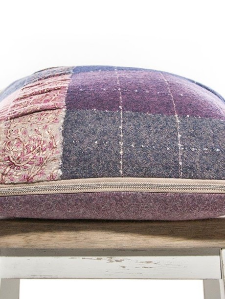 This one of a kind purple embroidered check throw pillow is made from a multi colored check of 100% felted wool, a luxury textile.